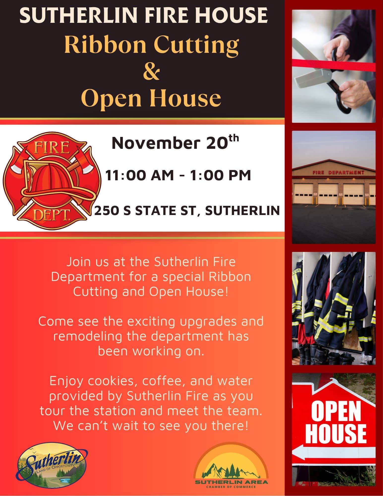Join the Sutherlin Area Chamber of Commerce Ambassadors at an Open House taking place on November 20 from 11 - 1. There will be tours to show off the structural changes made to make the Fire Station better able to survive potential disasters. Refreshments will be available.